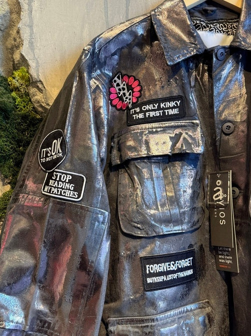 A handmade denim jacket with multiple treatments. Acid wash, distressed jean fabric, embroidered patches, handpaintings, and statement labels are creating a high level jacket that we truly need in our wardrobe!
