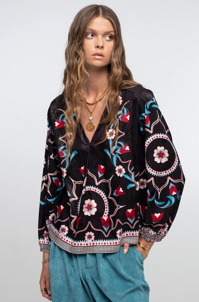 The Nadia Top is a blouse with a very nice aesthetic. A garment with movement in fine viscose. It combines perfectly with the OMARIA SHORTS for cooler looks or with the NADIA PANTS for more special ones.