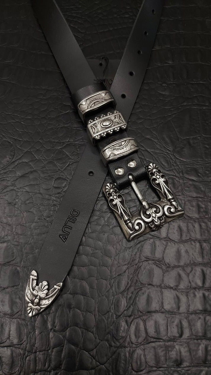 Handmade leather belt with metal carved buckle.