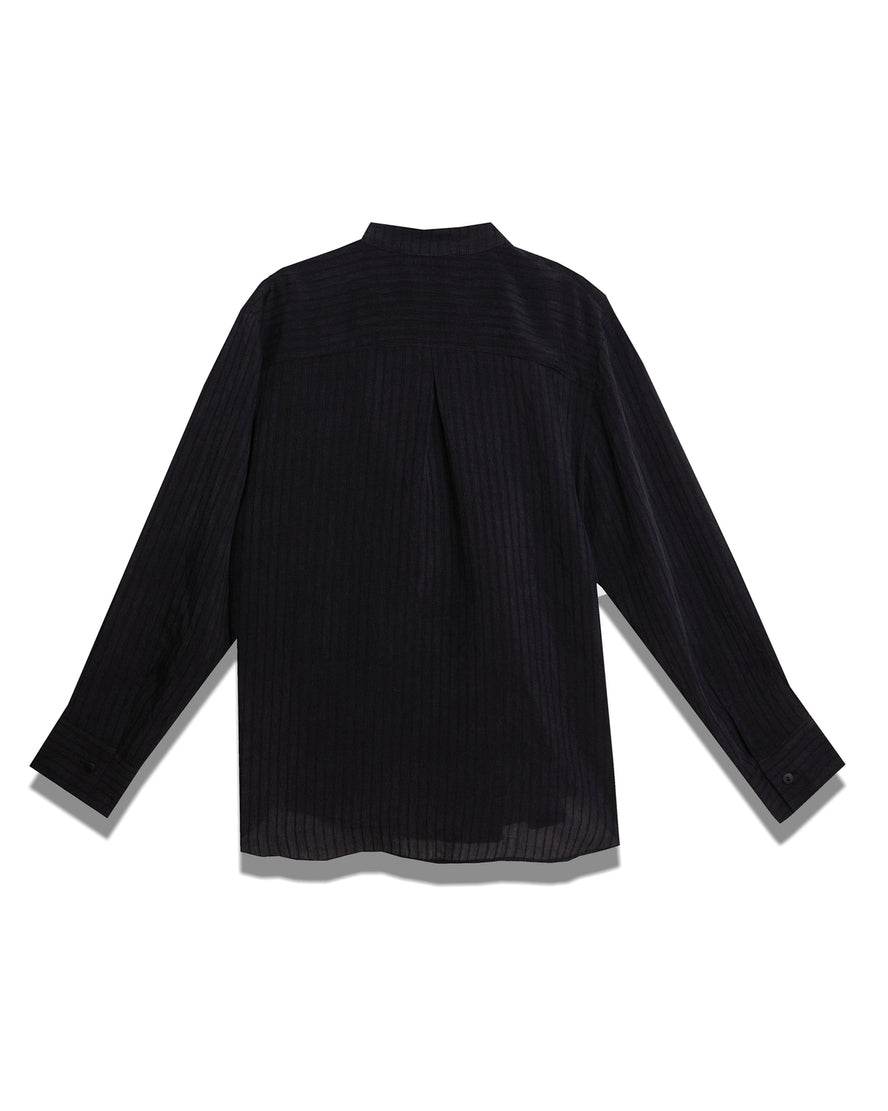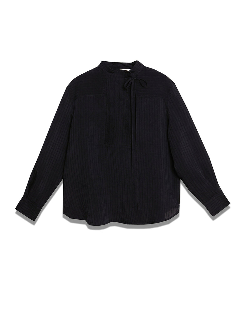 Το Melanie πουκάμισο σε μαύρο pinstripe παίζει με την κομψότητα και τη δομή — με διακριτικές πιέτες στο στήθος και κρυφά κουμπιά που του δίνουν φινίρισμα υψηλής αισθητικής.