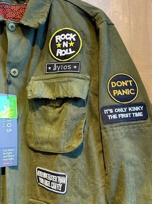 A handmade denim jacket with multiple treatments. Acid wash, distressed jean fabric, embroidered patches, handpaintings, and statement labels are creating a high level jacket that we truly need in our wardrobe!