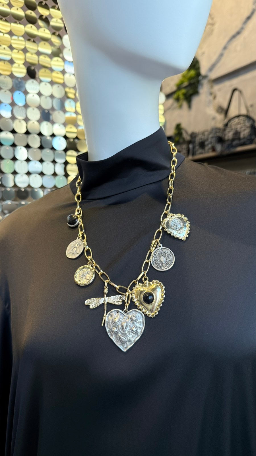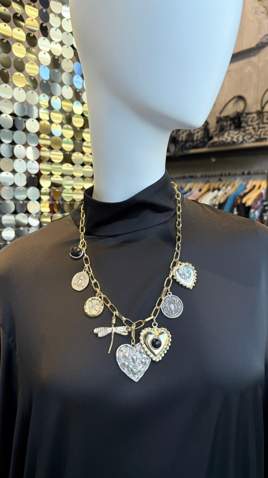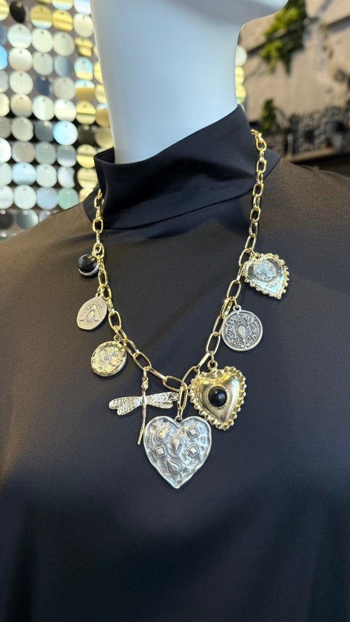 Χειροποίητο κολιέ από ατσάλινη αλυσίδα με χρυσά και ασημί κρεμαστά διακοσμητικά. Ταιριάξτε το απόλυτα με το ΒΡΑΧΙΟΛΙ ΔΙΧΡΩΜΑ ΚΡΕΜΑΣΤΑ