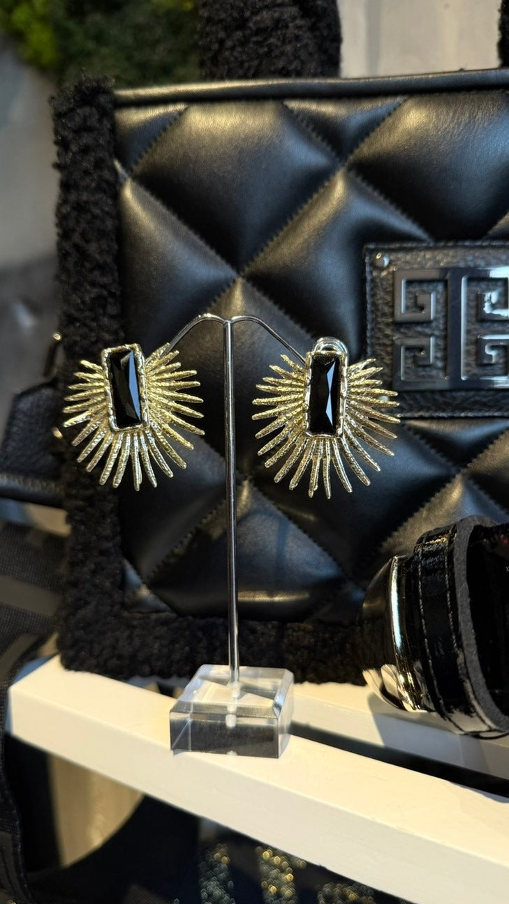Σκουλαρίκια καρφωτά σε σχήμα χρυσές ακτίνες με μαύρη πέτρα.