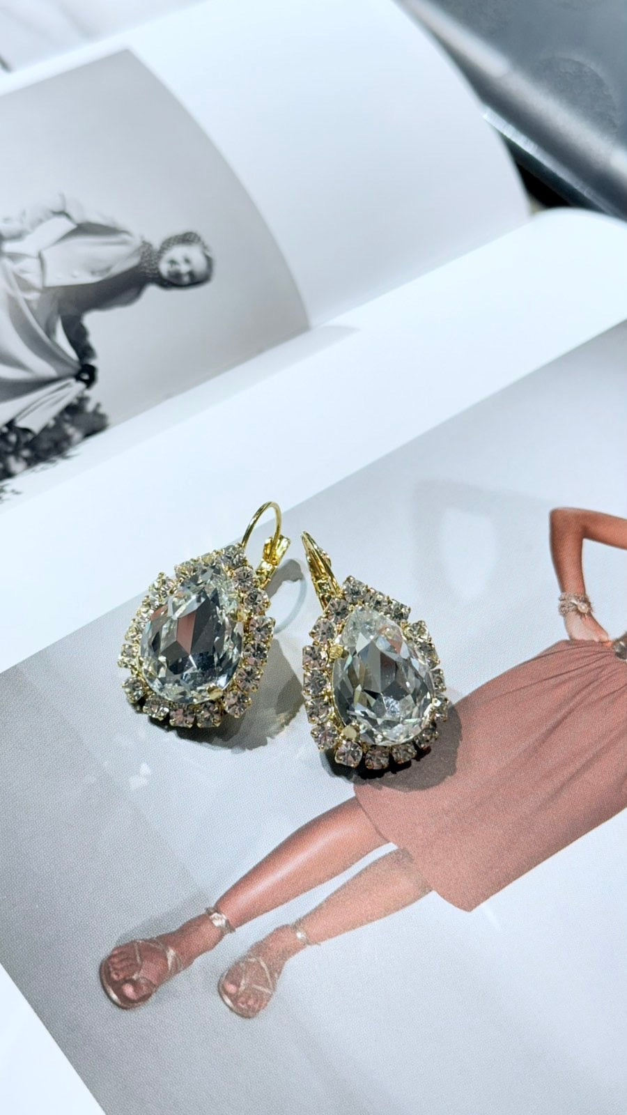 Κρεμαστά σκουλαρίκια σε σχήμα δάκρυ με διαφανές πέτρα, περιτριγυρισμένη με μικρότερες διαφανές πέτρες.