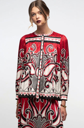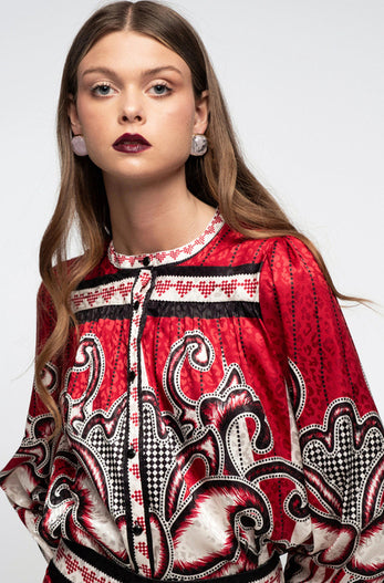 Το Alchemy Shirt ξεχωρίζει με το placement print του που αποπνέει κομψότητα. Το σατέν jacquard ύφασμα του δίνει μια vintage αίσθηση, ενώ ο όρθιος γιακάς του προσθέτει κομψότητα. Τα φουσκωτά μανίκια έχουν σούρες στους ώμους και στις μανσέτες και κλείνουν με textured κουμπιά, ενώ αντίστοιχα κουμπιά διακοσμούν και το μπροστινό του μέρος. Συνδυάστε το με τη Alchemy Long Skirt για ένα κομψό boho σύνολο.