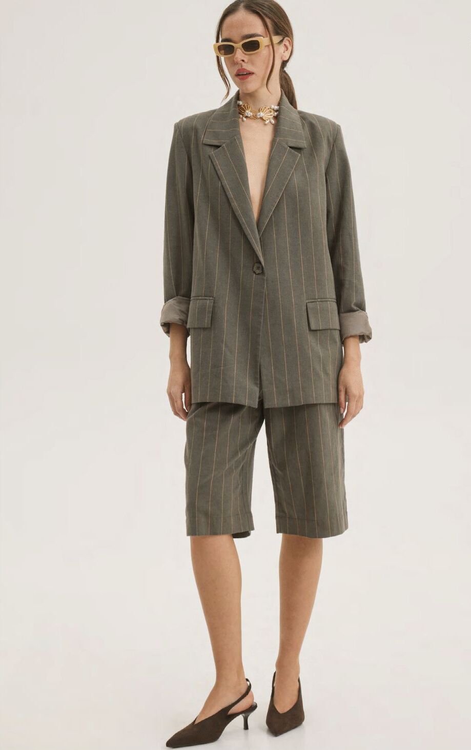Το Amanda Set σε φίνο εμπλουτισμένο βαμβάκι με λινό είναι το απόλυτο κοστούμι της σεζόν. Cool διάθεση στη βερμούδα και αυστηρή ρίγα στο ύφασμα δίνουν ένα αποτέλεσμα που μπορεί να καλύψει διάφορες στιγμές της καθημερινότητάς σου.