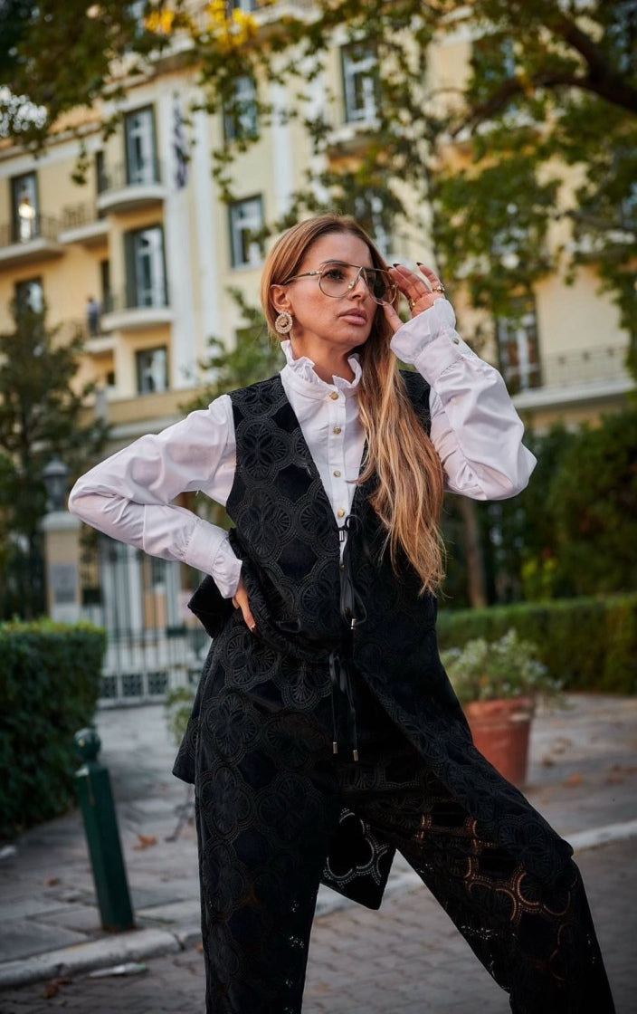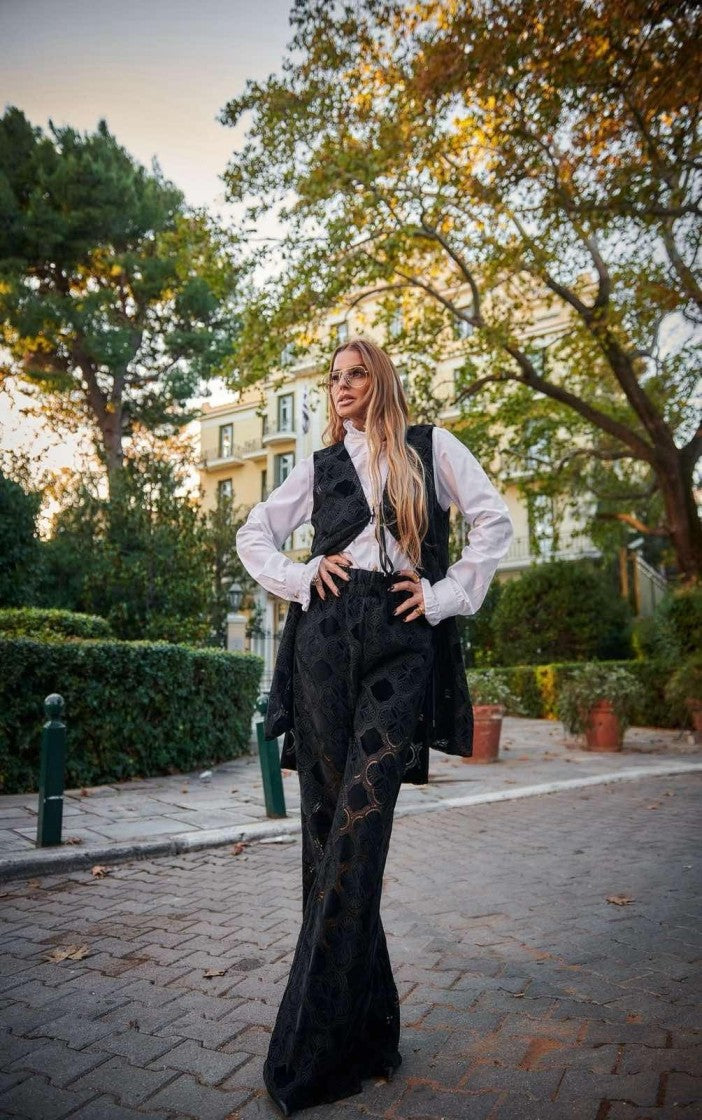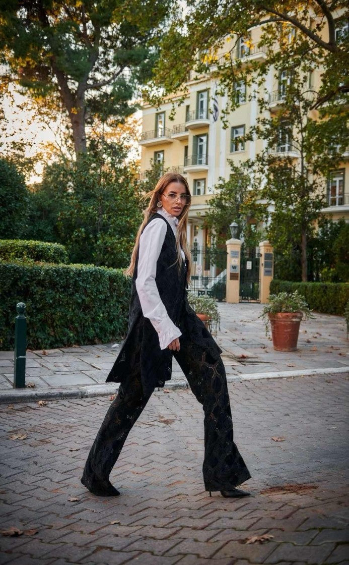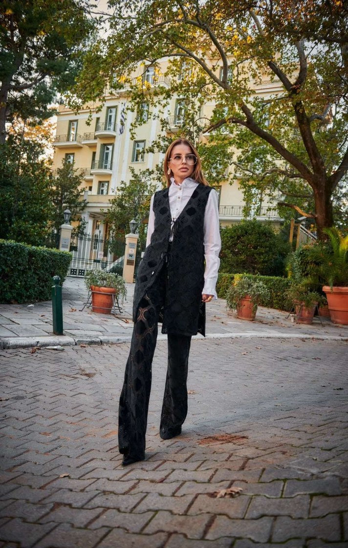 Το Anaia Set σε μαύρο ξεχωρίζει με το ελαφρύ, ημιδιάφανο βελούδινο ύφασμα που προσφέρει μία αίσθηση πολυτέλειας και άνεσης. Το μακρύ γιλέκο με τη μεσάτη γραμμή και τα δύο δεσίματα μπροστά, συνδυάζονται τέλεια με το παντελόνι καμπάνα για ένα look που ισορροπεί ανάμεσα κομψότητα και σύγχρονο look.