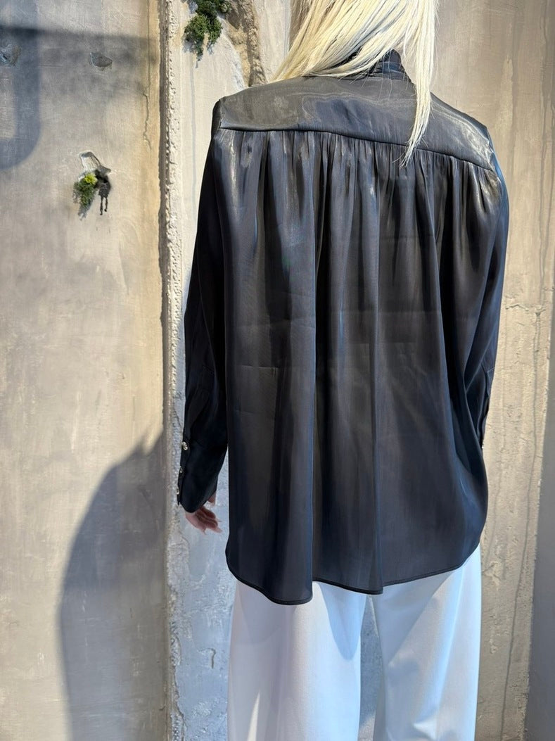 Το Bright Shirt είναι το απόλυτο statement κομμάτι που τραβάει τα βλέμματα. Με υφή που θυμίζει καθρέφτη και σατέν λάμψη που αιχμαλωτίζει το φως, αυτή η loose fit δημιουργία συνδυάζει αισθησιασμό με κομψότητα. Τα μακριά μανίκια με κουμπιά στις μανσέτες και το δέσιμο στο λαιμό διατηρούν την κλασική του γραμμή. Ιδανική για βραδινές εμφανίσεις ή εντυπωσιακά layering looks.