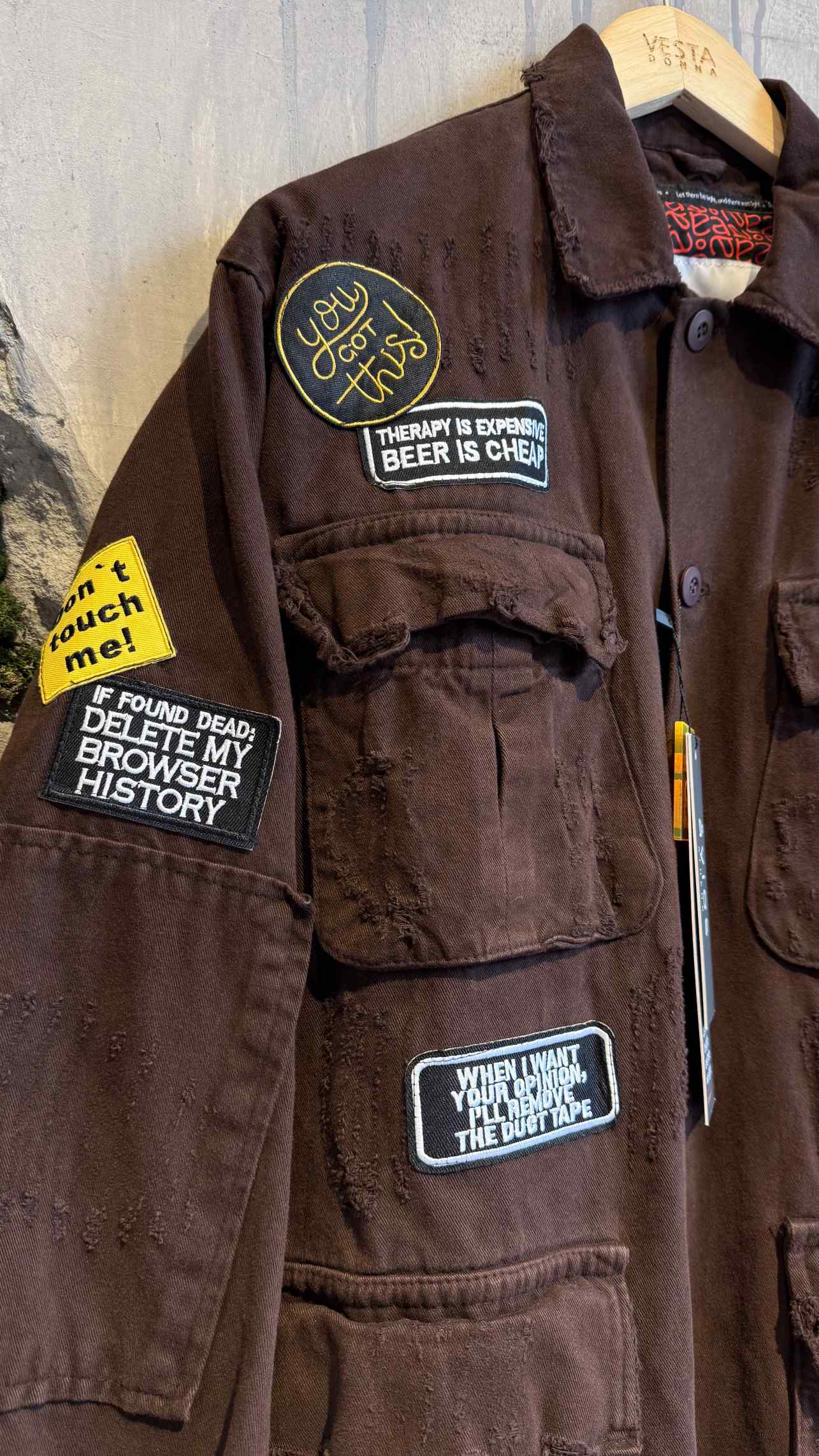 A handmade denim jacket with multiple treatments. Acid wash, distressed jean fabric, embroidered patches, handpaintings, and statement labels are creating a high level jacket that we truly need in our wardrobe!