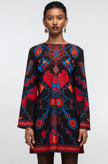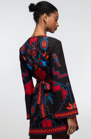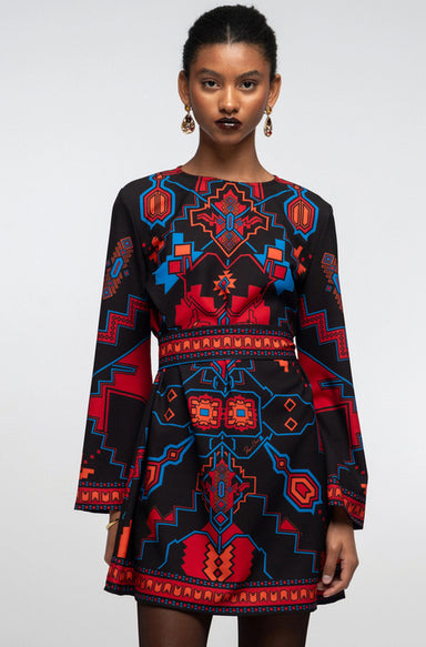 Το Chronicle Short Dress έχει έντονο placement print σχέδιο με δυνατά σύμβολα και ζωντανά χρώματα πάνω σε κρεπ ύφασμα. Έχει μακριά καμπάνα μανίκια και Α-γραμμή, ενώ μπορεί να φορεθεί με ή χωρίς την ασορτί ζώνη. Το κρυφό φερμουάρ στο πίσω μέρος εξασφαλίζει άψογη εφαρμογή.