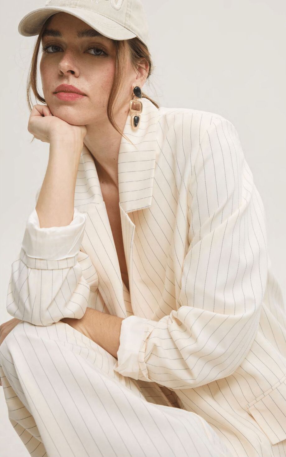 Το Jeraldine Suit σε εκρού με λεπτές μαύρες ρίγες αποπνέει κομψότητα με δυναμική, σύγχρονη αισθητική. Το σακάκι και το μακρύ παντελόνι αγκαλιάζουν τη σιλουέτα με structured γραμμή, ενώ το γεμάτο χυτό ύφασμα χαρίζει πολυτέλεια και effortless στυλ.