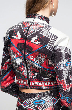 Το Legacy Turtleneck Top συνδυάζει παραδοσιακά και μοντέρνα μοτίβα, διακοσμημένα με παγιέτες για ένα κομψό αποτέλεσμα. Τα μακριά μανίκια με βάτες στους ώμους τονίζουν την σιλουέτα, ενώ ο ψηλός λαιμός ισορροπεί με το cropped μήκος. Το φερμουάρ στο πίσω μέρος εξασφαλίζει άνετη εφαρμογή. Συνδυάστε το με την ασορτί Legacy Long Skirt και το Legacy Pouch για ένα εντυπωσιακό βραδινό outfit.