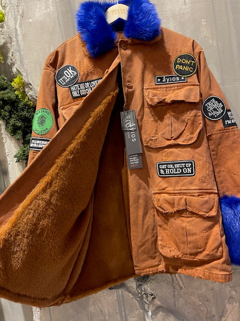 Ένα χειροποίητο denim τζάκετ με πολλαπλές επεξεργασίες, εσωτερική επένδυση γούνας, μακρύτριχη γούνα στο γιακά και στις μανσέτες . Πετροπλύσιμο, φθορές, κέντημα, ζωγραφική και statement ετικέτες δημιουργούν ένα πανωφόρι υψηλών απαιτήσεων. Καλοδουλεμένο και έξυπνο μας προκαλεί να το θέλουμε στην γκαρνταρόμπα μας!