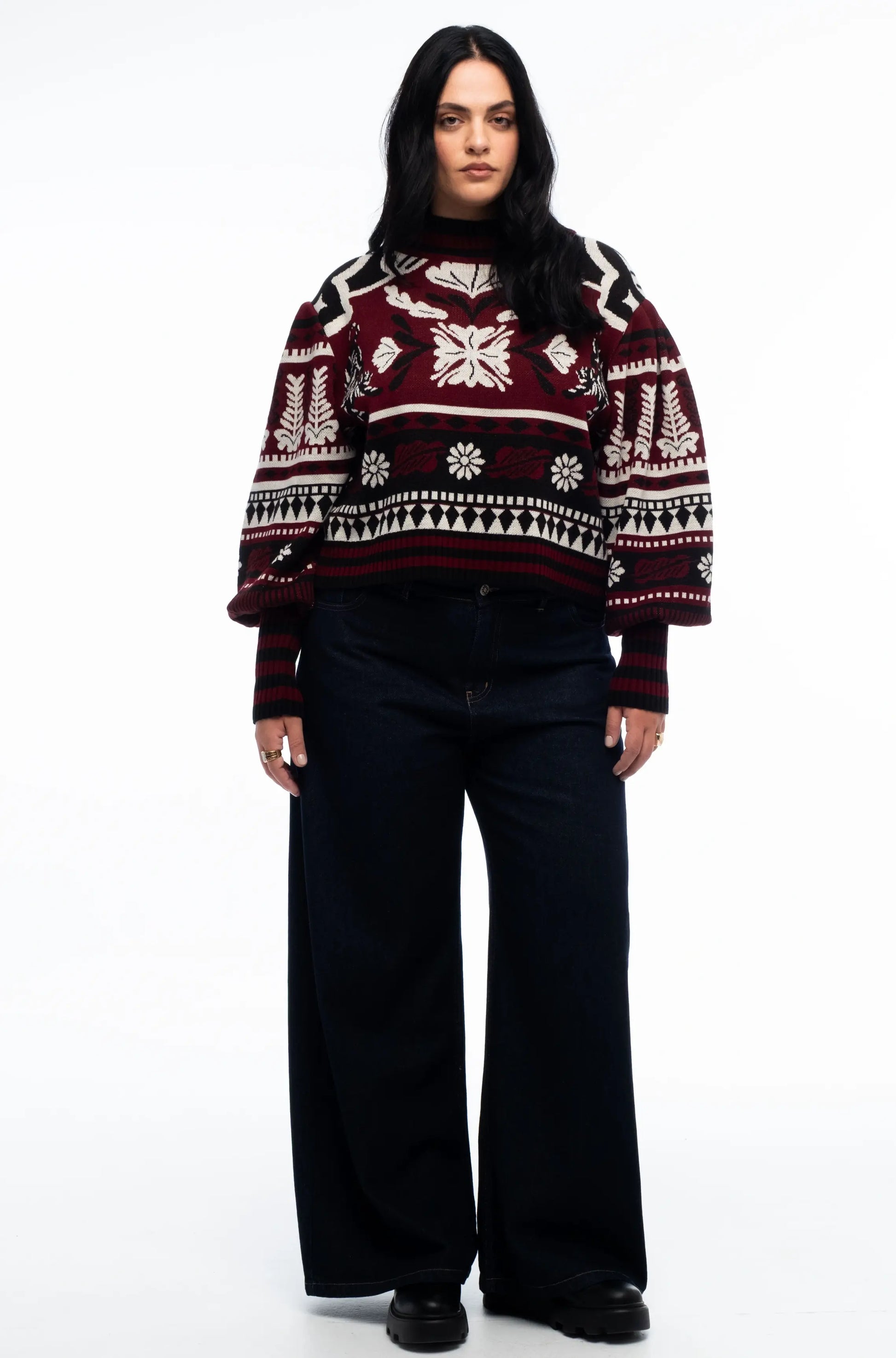 Ένα πλήρως πλεκτό, το Mythical Top μας διαθέτει μανίκια Juliet και μανσέτες, στρίφωμα και λαιμόκοψη με print σε αντίθεση. Αυτό το πλεκτό πουλόβερ Intarsia συνδυάζει μοτίβα εμπνευσμένα από την παραδοσιακή τέχνη με εκρού και μαύρο σε ζεστό κόκκινο. Φορέστε το με το αγαπημένο σας P+C Karmic Denim για να σας κρατάει ζεστούς και κομψούς όταν το φθινόπωρο μεταβαίνει στον χειμώνα.